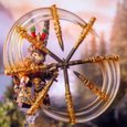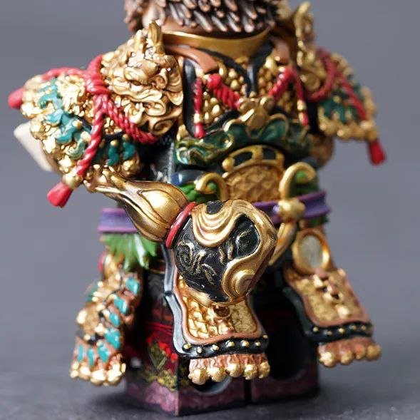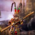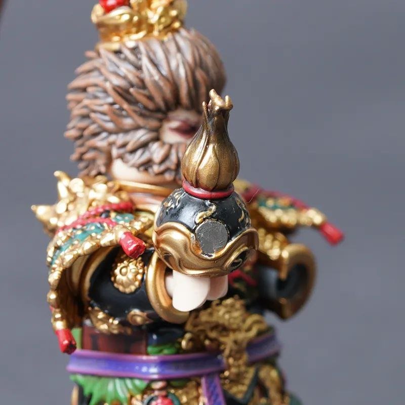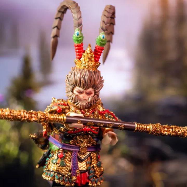 This figure depicts Sun Wukong, the legendary Monkey King, in a powerful and dramatic pose. Dressed in ornate golden armor adorned with intricate patterns, he wields his iconic Ruyi Jingu Bang staff, which radiates energy as it spins with incredible force. His facial expression reflects a blend of ferocity and confidence, embodying his mischievous yet heroic nature.