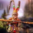 The swirling staff effect captures his supernatural agility and unmatched combat prowess. The bright crown with feathered ornaments atop his head emphasizes his divine heritage. This depiction perfectly captures the moment before a devastating strike.