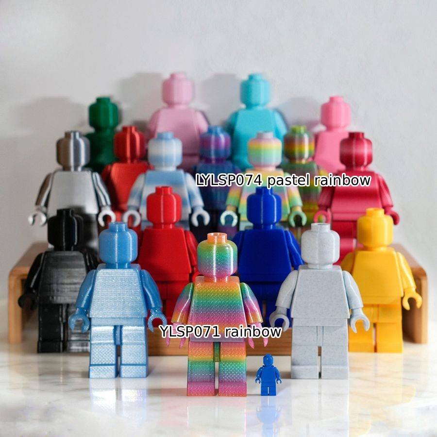 These large LEGO monotone minifigures are a striking display of simplicity and creativity. Each figure, cast in a single bold color, showcases the timeless design of the iconic minifig form on a much larger scale. From matte black and metallic silver to bright yellow and vibrant rainbow hues, their uniform shape and varying tones create a captivating visual gradient.