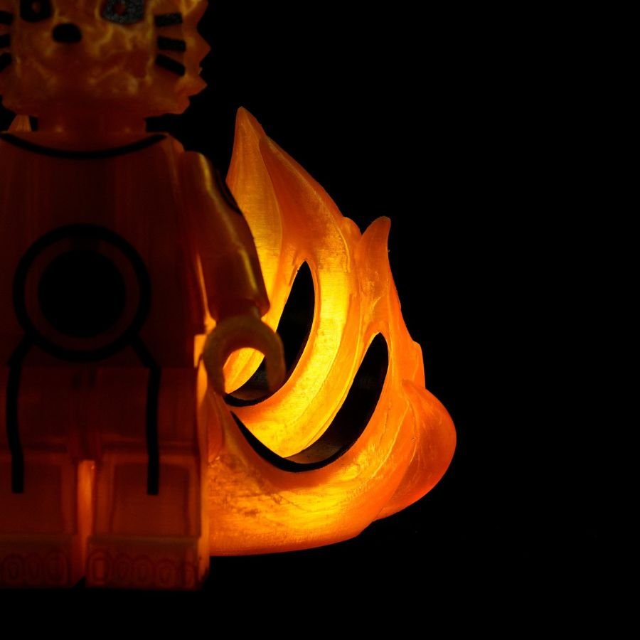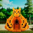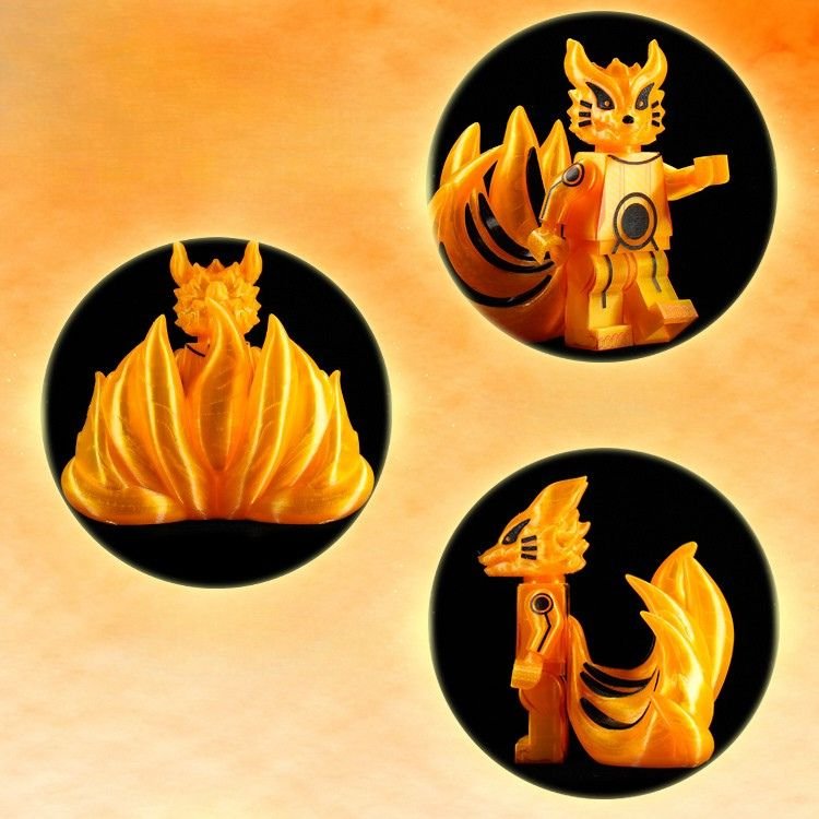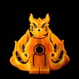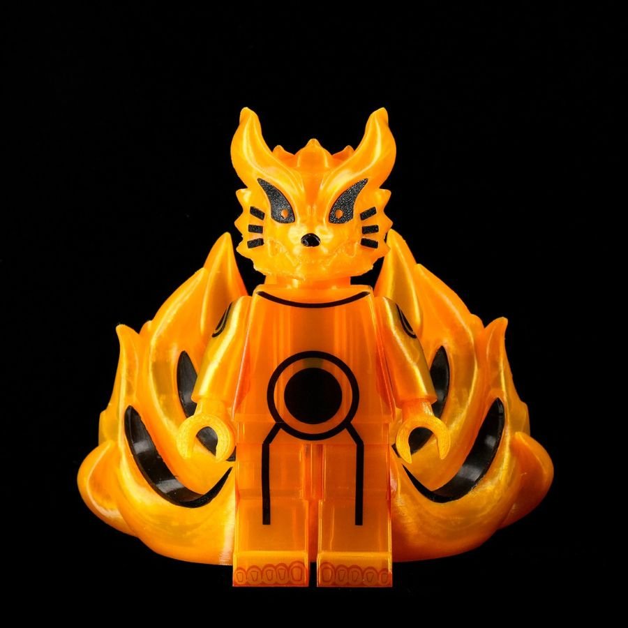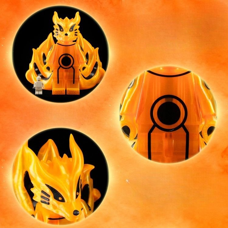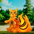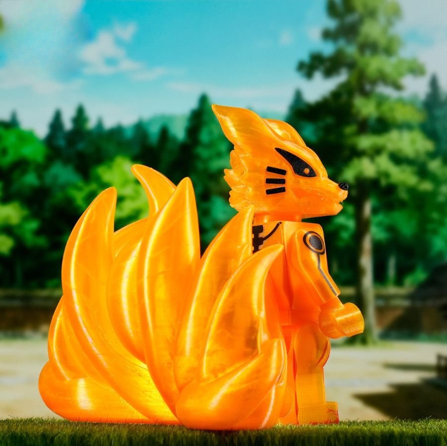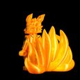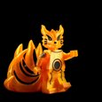 This radiant kitsune emanates an aura of divine fire, its body shimmering with golden energy that dances like living flame. Its nine tails, symbols of immense power and wisdom, ripple with ethereal light — each one holding centuries of knowledge and fury. The sleek markings across its body resemble ancient seals, binding both chaos and balance within. Its eyes gleam with intelligence and ferocity, reflecting the dual nature of protector and destroyer. This celestial fox stands as both guardian spirit and unstoppable force of nature. It is a being of legend, born from pure chakra and will.