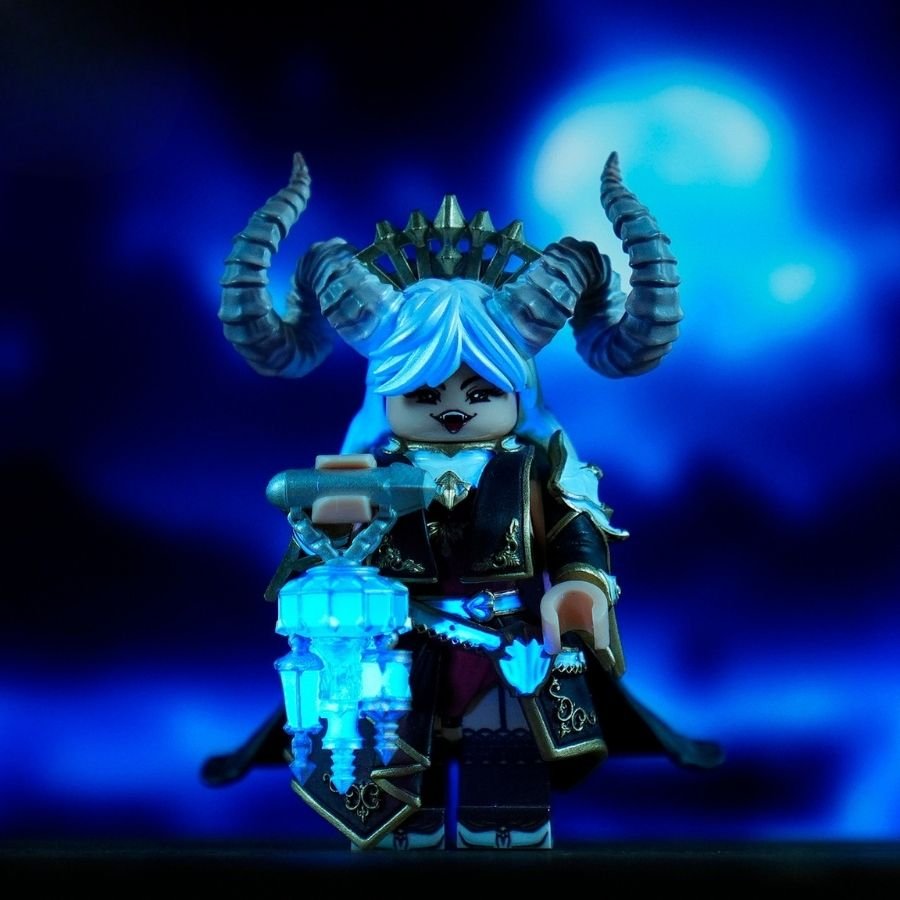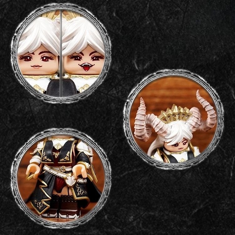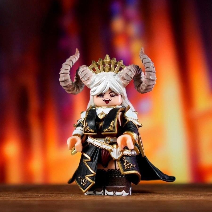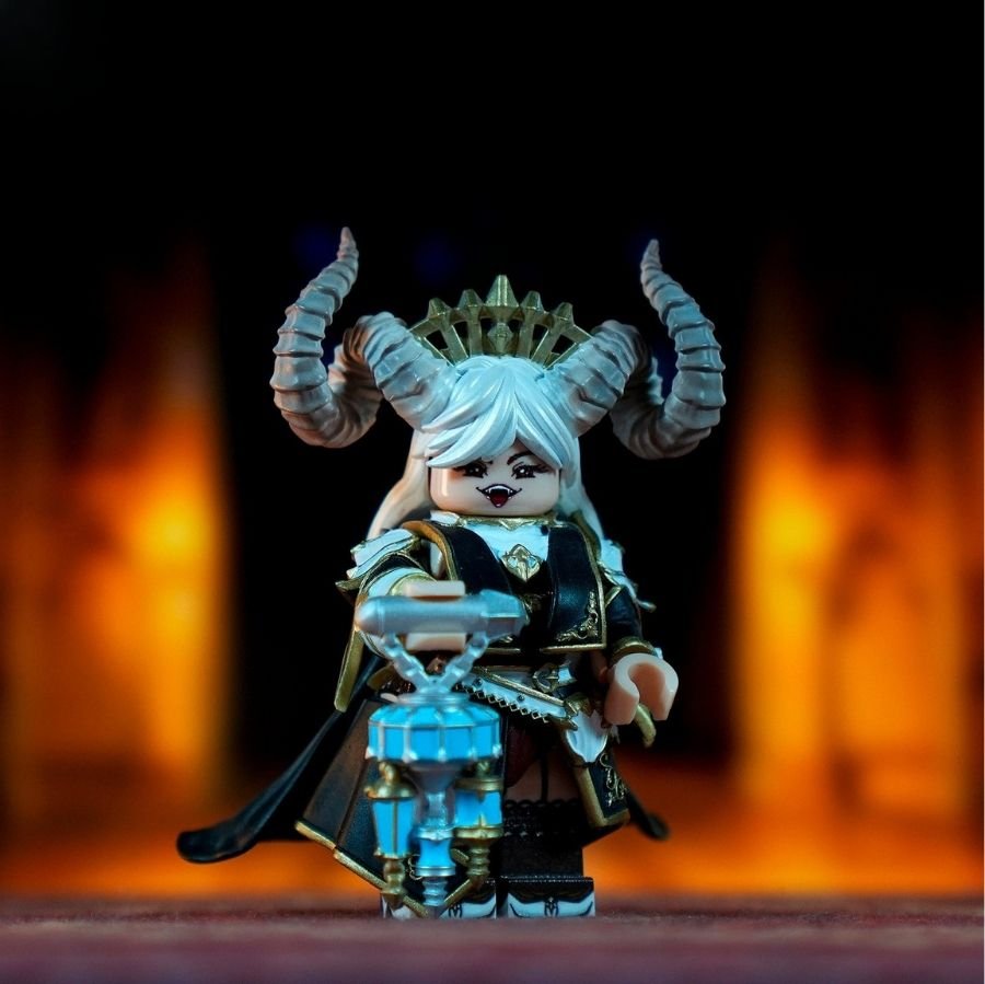 She is a regal succubus queen minifigure with curled demon horns, a jeweled crown, and an elegant yet dangerous presence. Her flowing silver hair and calm expression contrast beautifully with the sinister glow of her magical weapon.