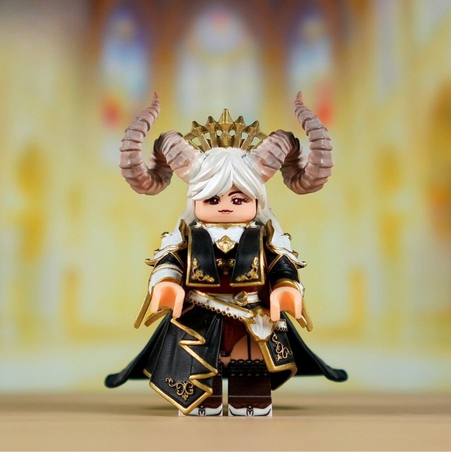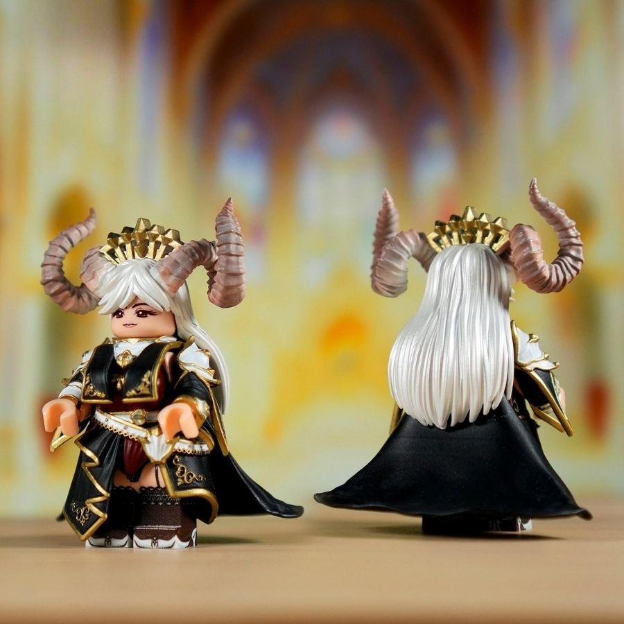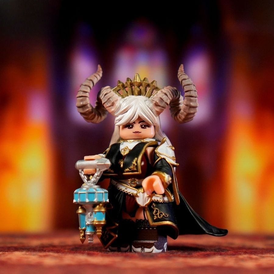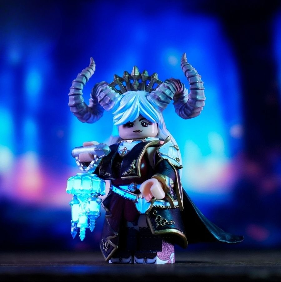 She is a regal succubus queen minifigure with curled demon horns, a jeweled crown, and an elegant yet dangerous presence. Her flowing silver hair and calm expression contrast beautifully with the sinister glow of her magical weapon.