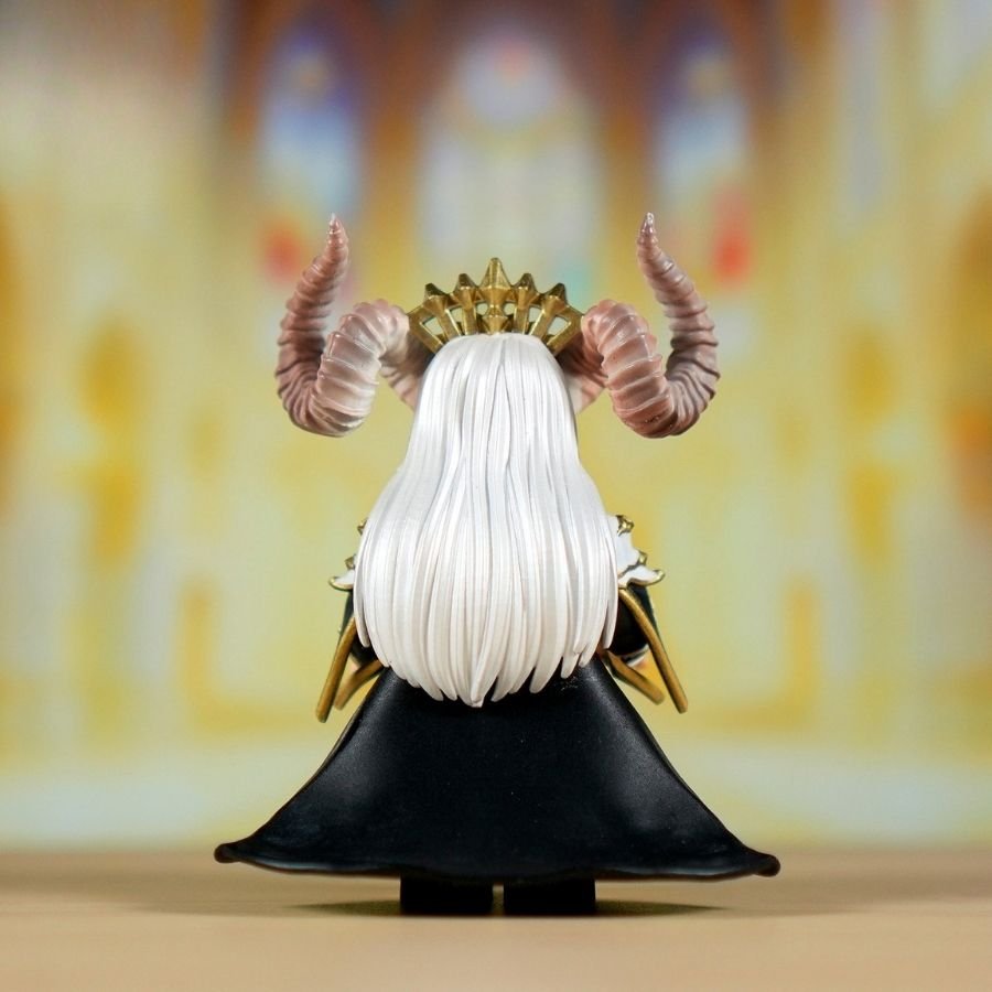 She wears ornate black-and-gold armor that blends royal elegance with infernal power. The overall design suggests a ruler who governs through charm, magic, and quiet intimidation rather than brute force.